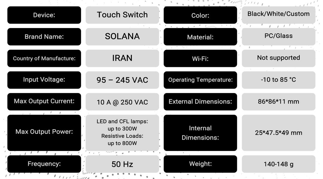 کلید های لمسی شرکت سولانا یکی از بهترین کلید های موجود در بازار است که با طراحی مدرن ونوآورانه جایگزینی زیبا و کاربردی برای کلید های سنتی هستند و در کارخانه ای مجهز در داخل ایران اقدام به تولید کلید استاندارد و با کیفیت نموده است که دارای کیفیت بالا می باشد. یکی از علل کیفیت و دوام این محصول استفاده از متریال و اجزایی با کیفیت در ساخت آن است. همچنین شرکت سولانا با تکیه بر نیرو های مجرب و استفاده از روش های نوین کلید های لمسی را تولید نموده است.