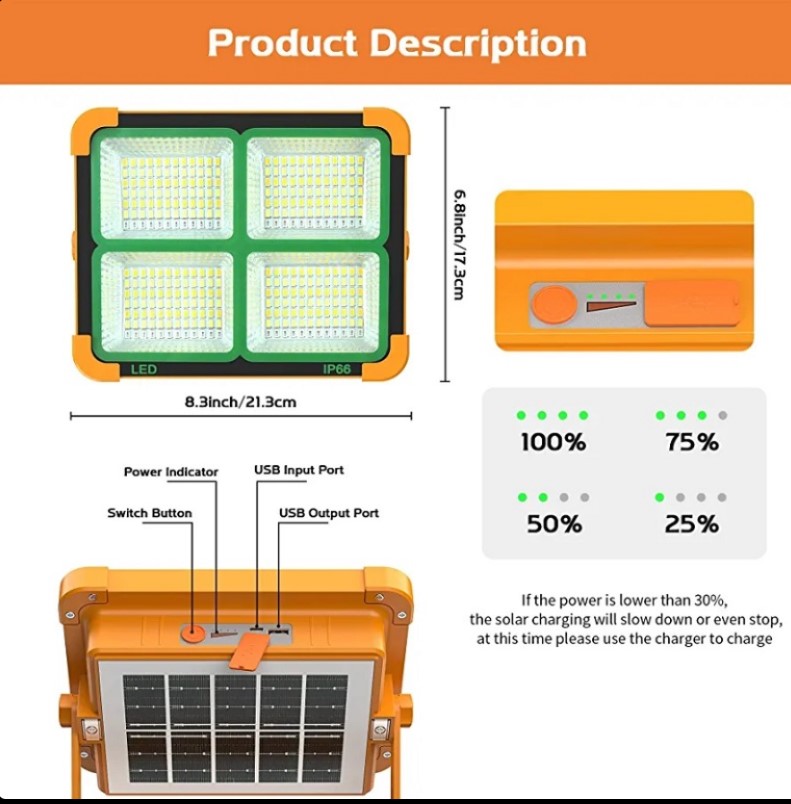 پشت این چراغ , صفحه خورشیدی دارد و با نور خورشید باتری آن شارژ میشود. نور افکن دستس دارای دسته و گیره میباشد.این چراغ برای انواع فعالیت ها , از جمله کمپینگ کوهنوردی ماهیگیری کار در معدن کشاورزی و تعمیر ماشین و... مورد استفاده قرار میگیرد . نوردهی این محصول دارای 5 حالت از جمله آفتابی , مهتابی , آفتابی و مهتابی پرنور , آفتابی و مهتابی کم نور و چراغ پلیسی آبی و قرمز چشمک زن است . می توان از حالت چشمک زن آن برای مواقع اضطراری و خطر استفاده کرد.